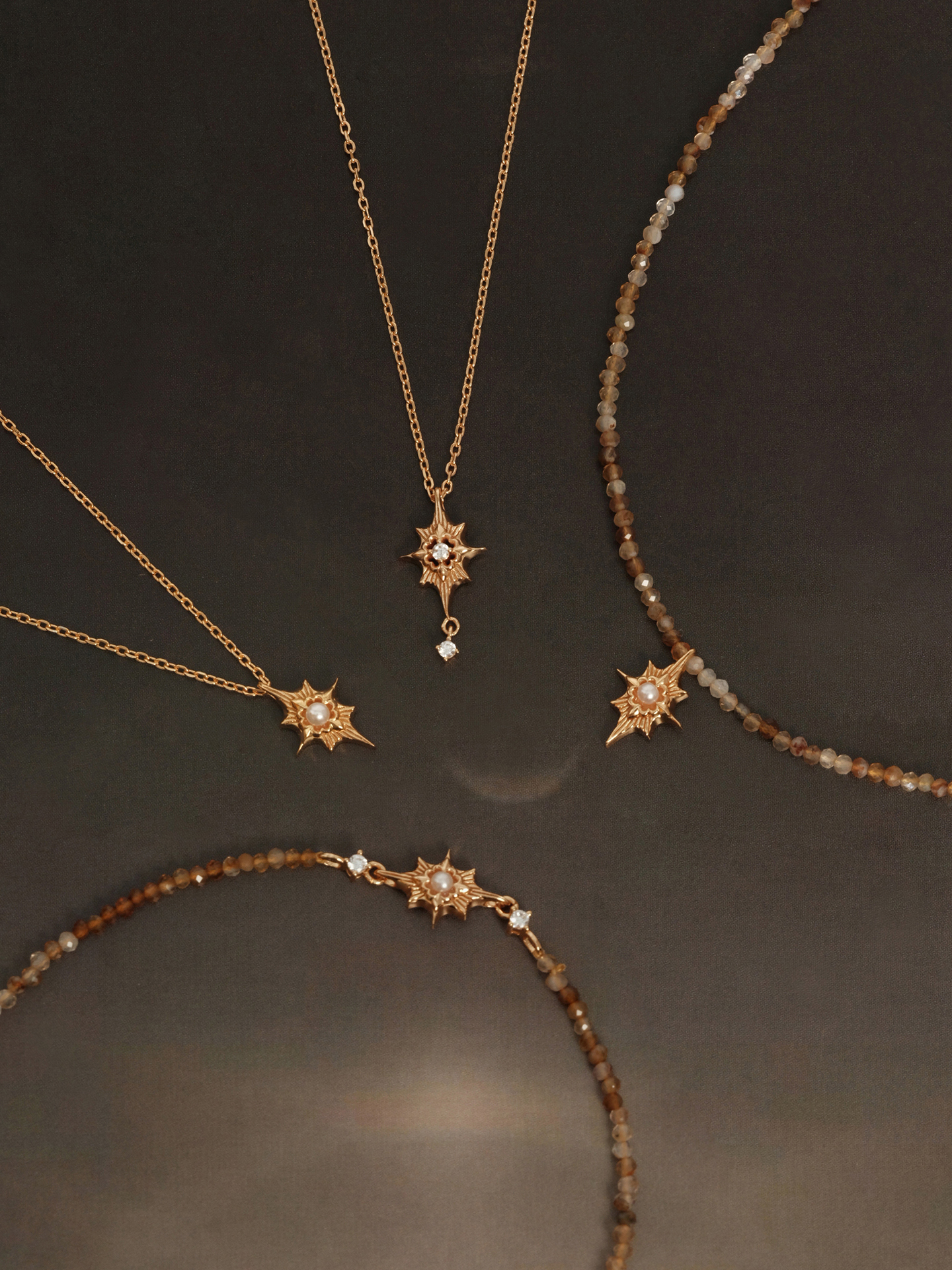 At its center lies a luminous pearl, softening the star’s sharp geometry with warmth and grace. Surrounded by golden rays, it glimmers like northern lights breaking through the night sky—an everyday miracle captured in precious metal.