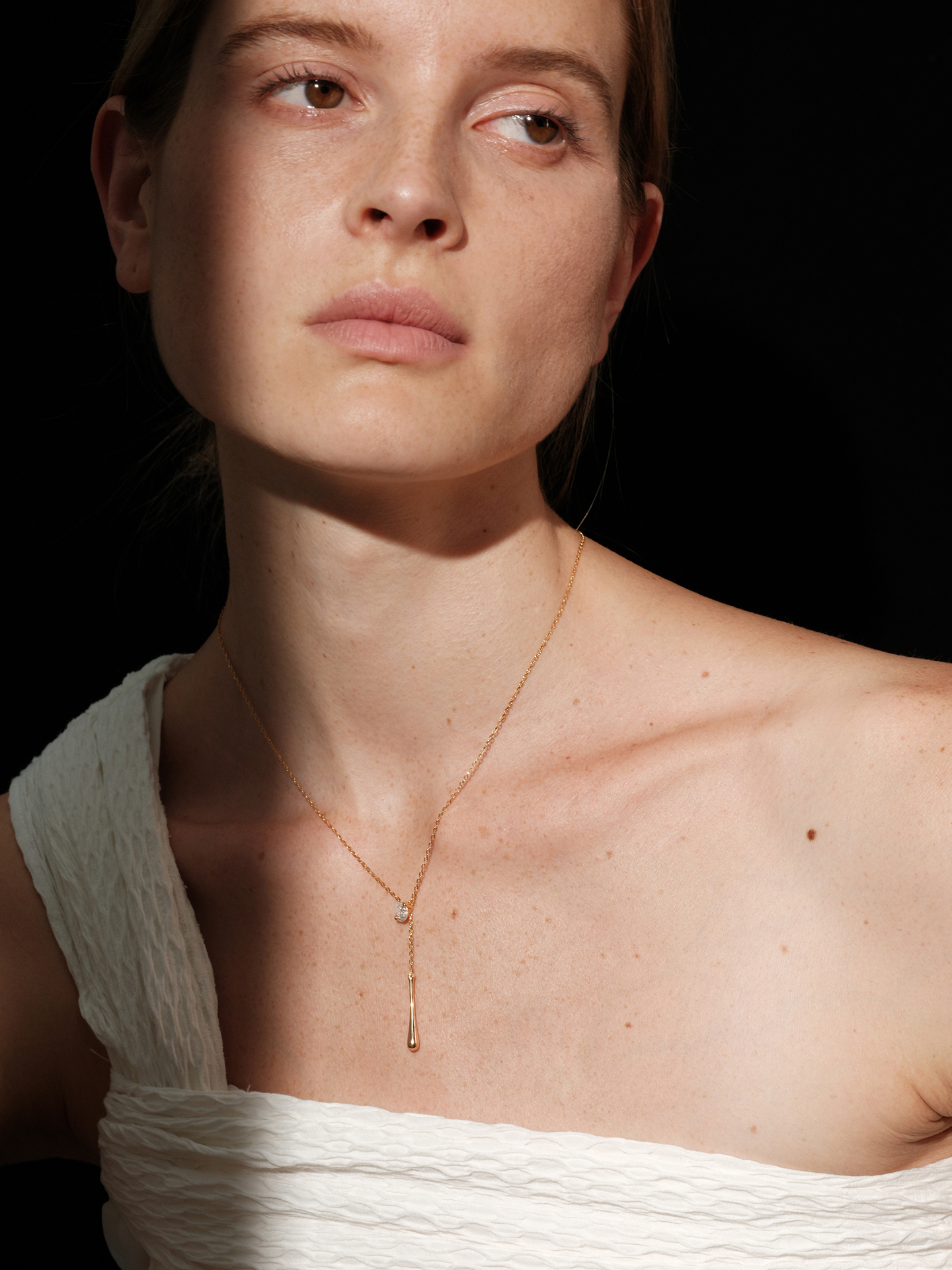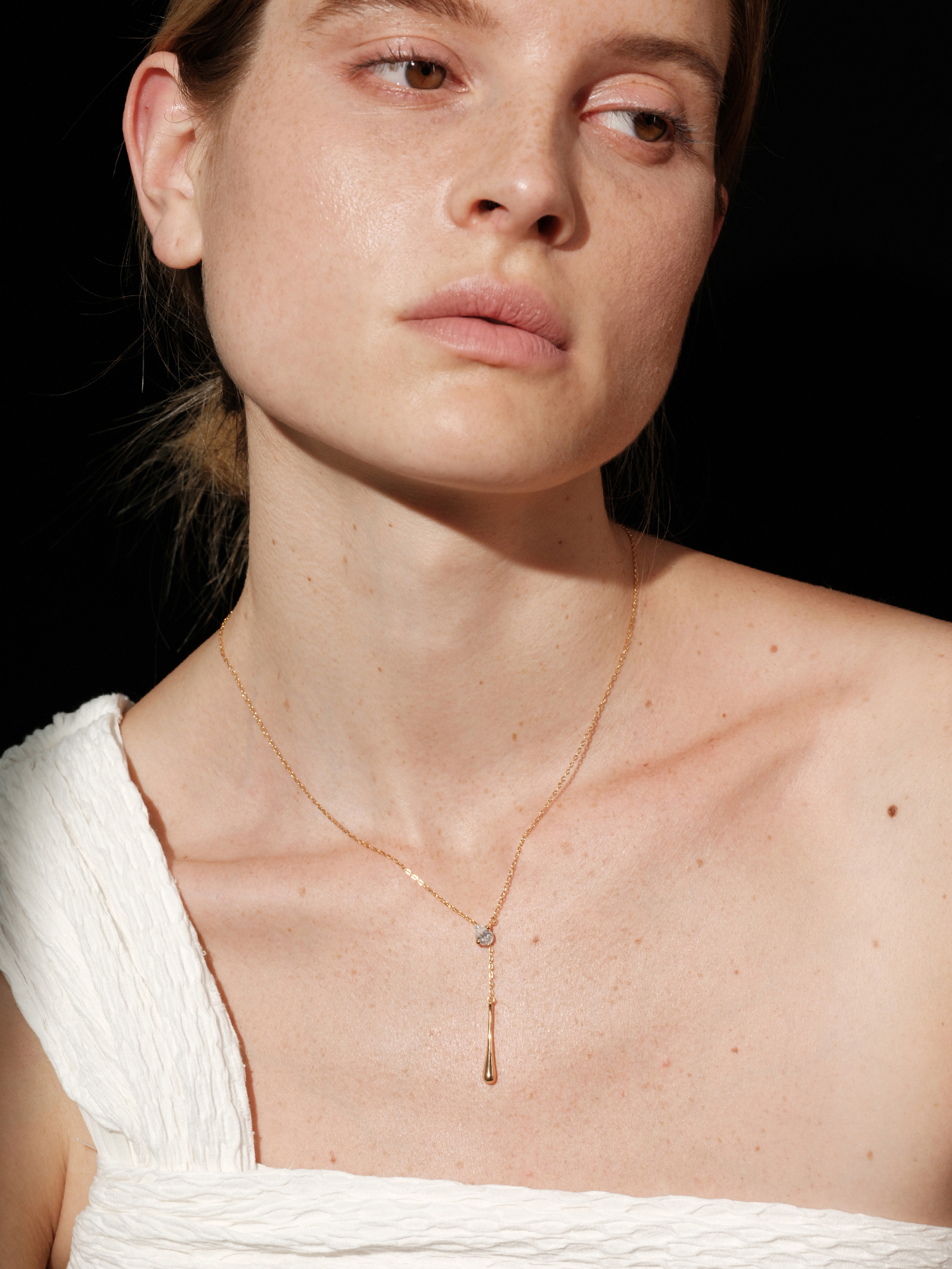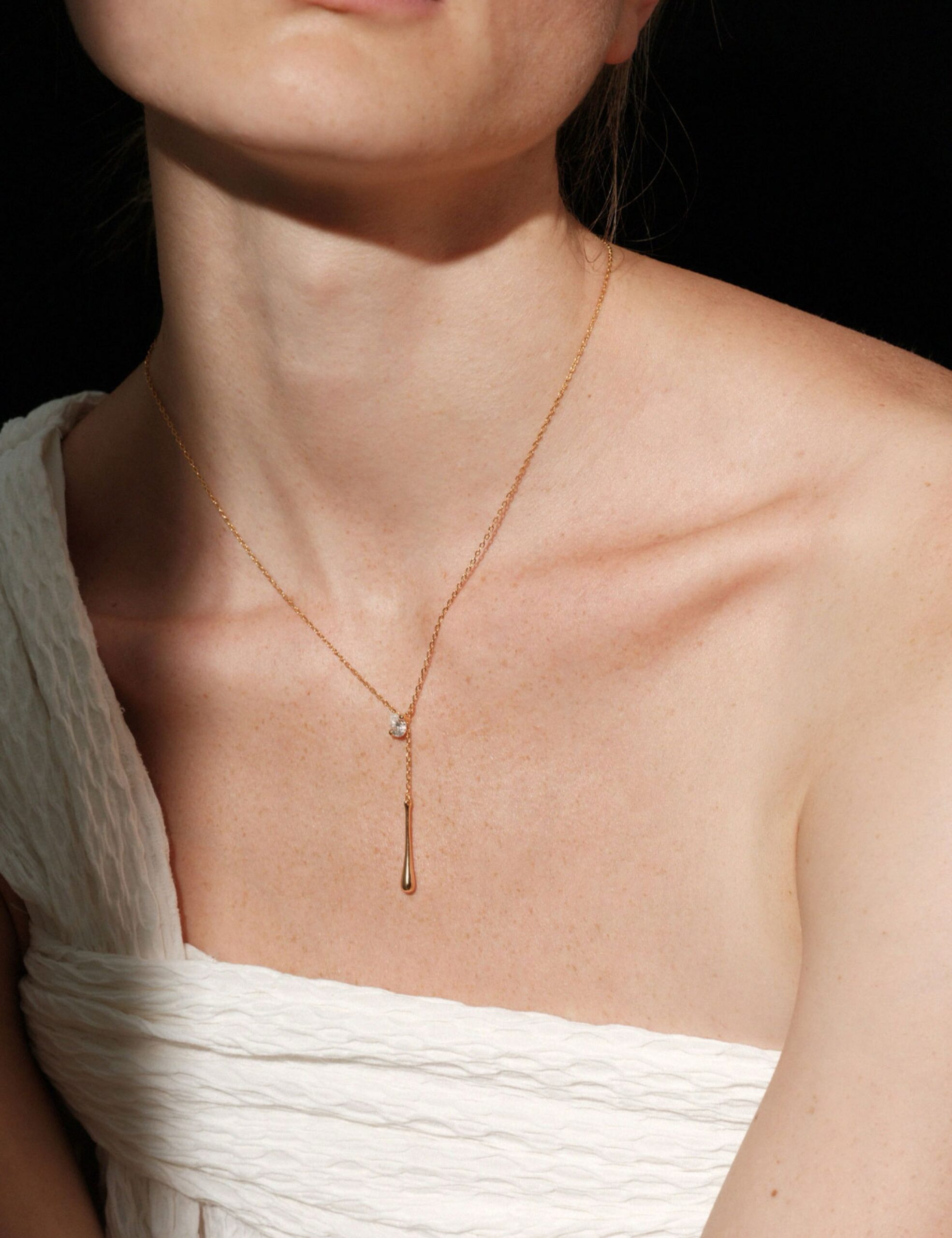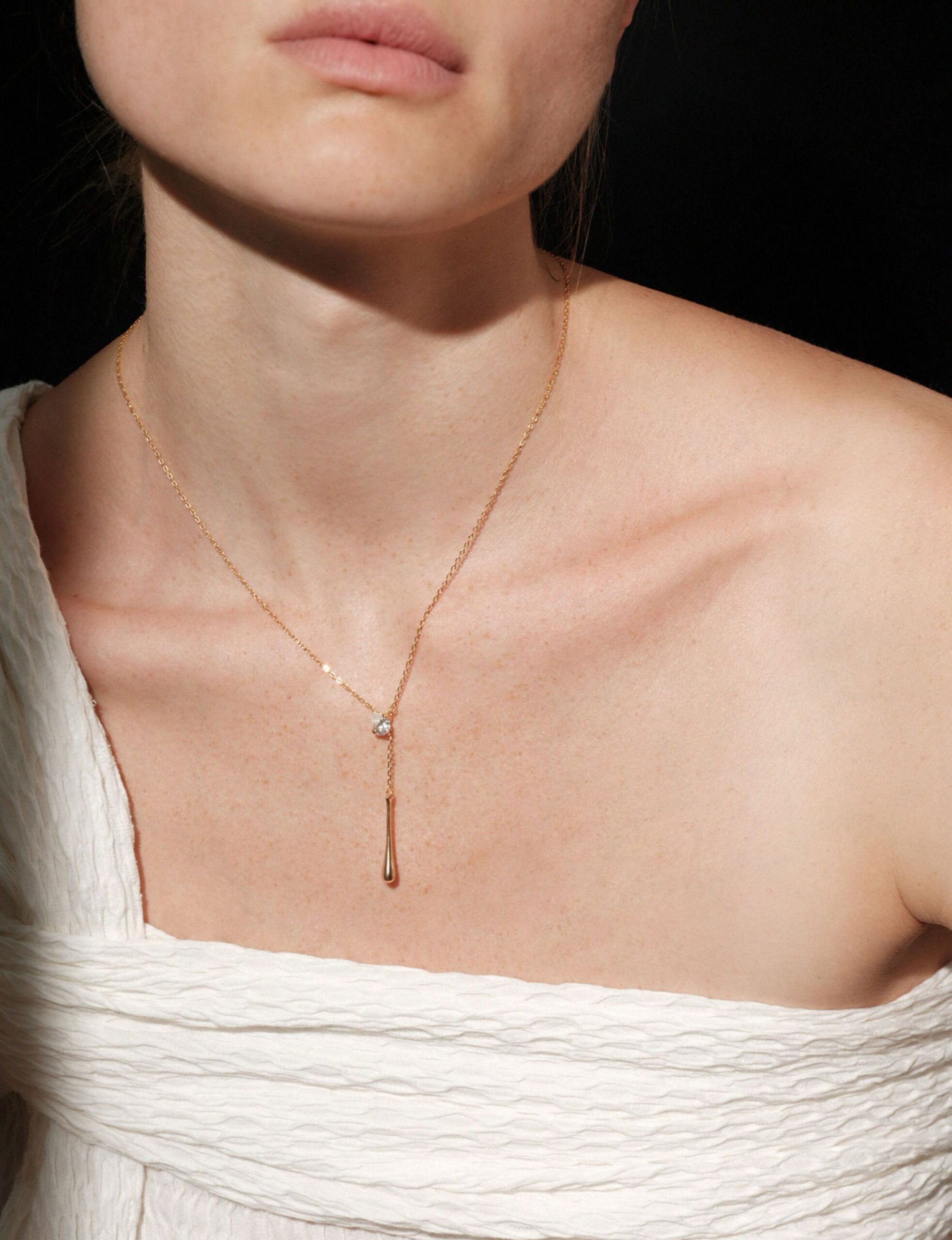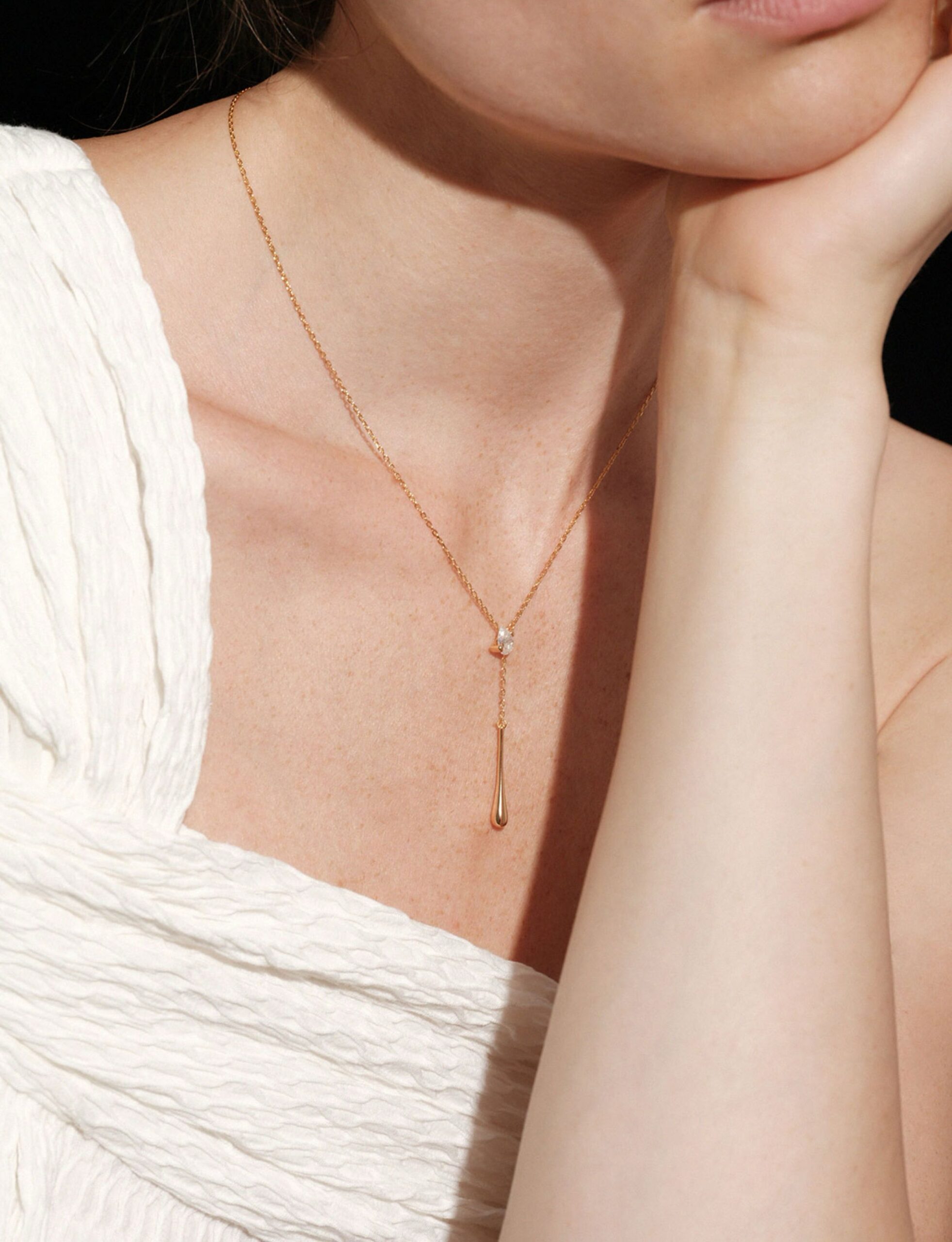 Inspired by the fleeting yet eternal moment of tacit understanding, the Echoes Necklace captures the silent dialogue between hearts. A golden raindrop pendant falls in perfect harmony with a sparkling tear-shaped cubic zirconia, symbolizing two distinct paths converging into one rhythm of light.
