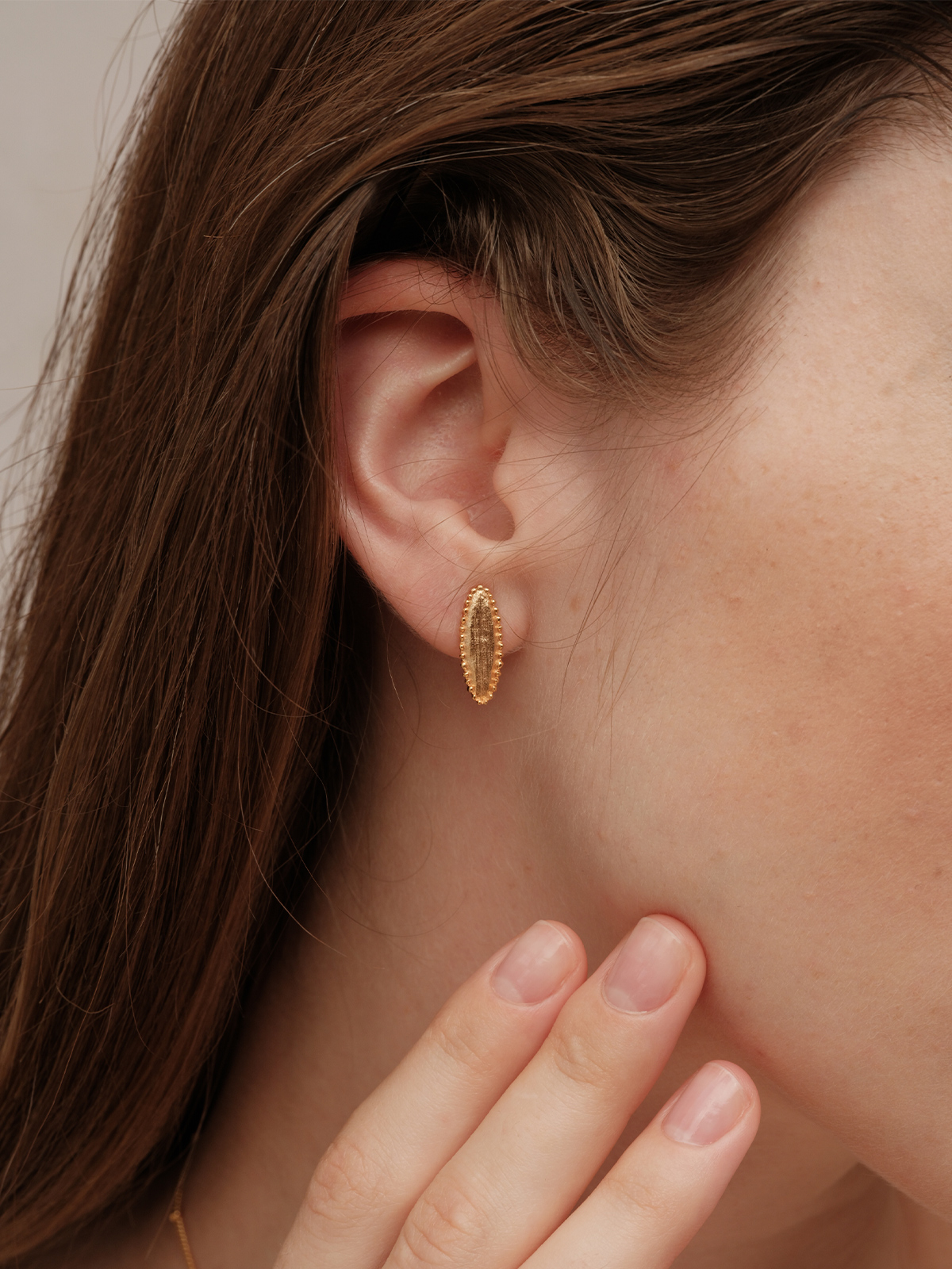 Right Earring (Style B): Single-leaf stud in sleek golden texture, minimalist and elegant.