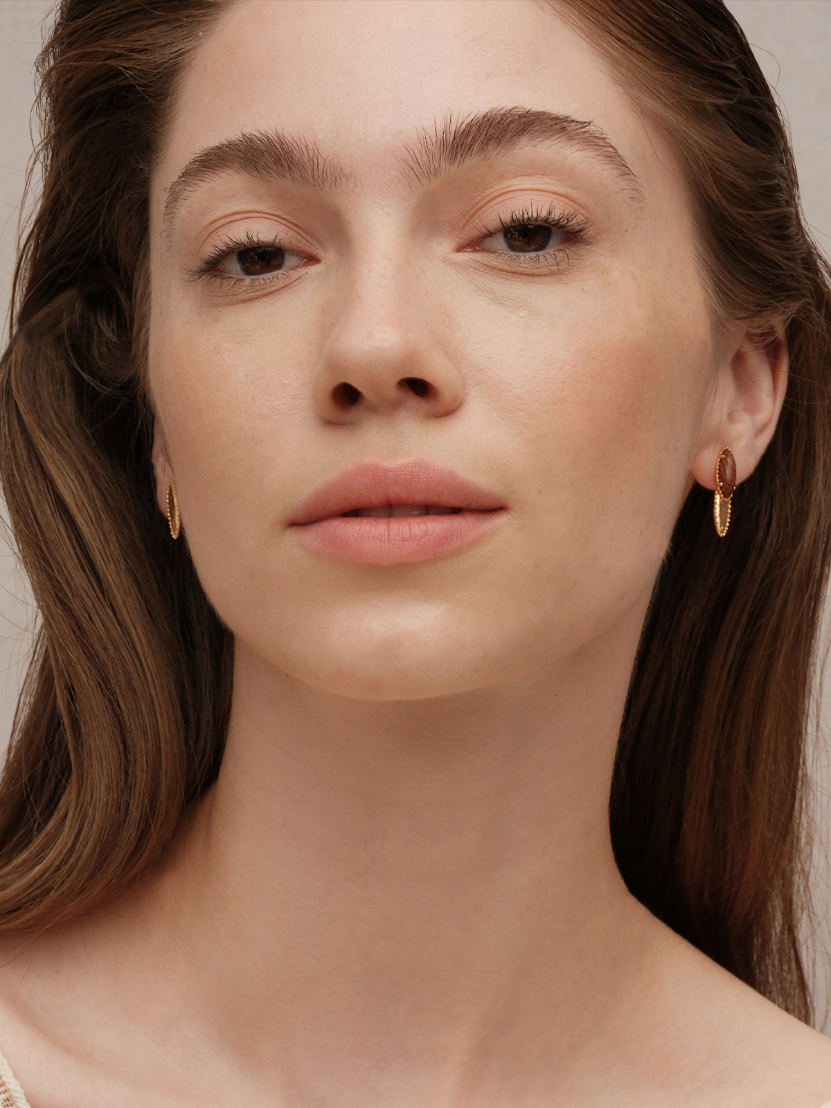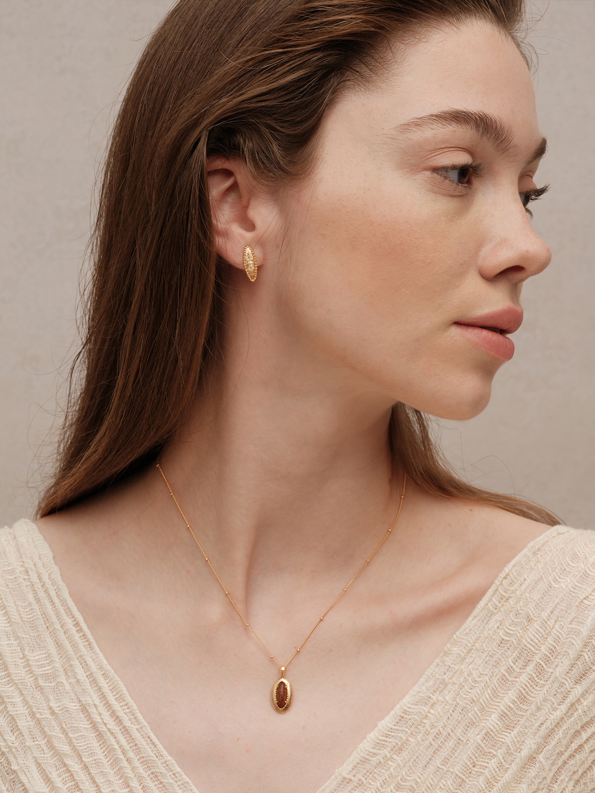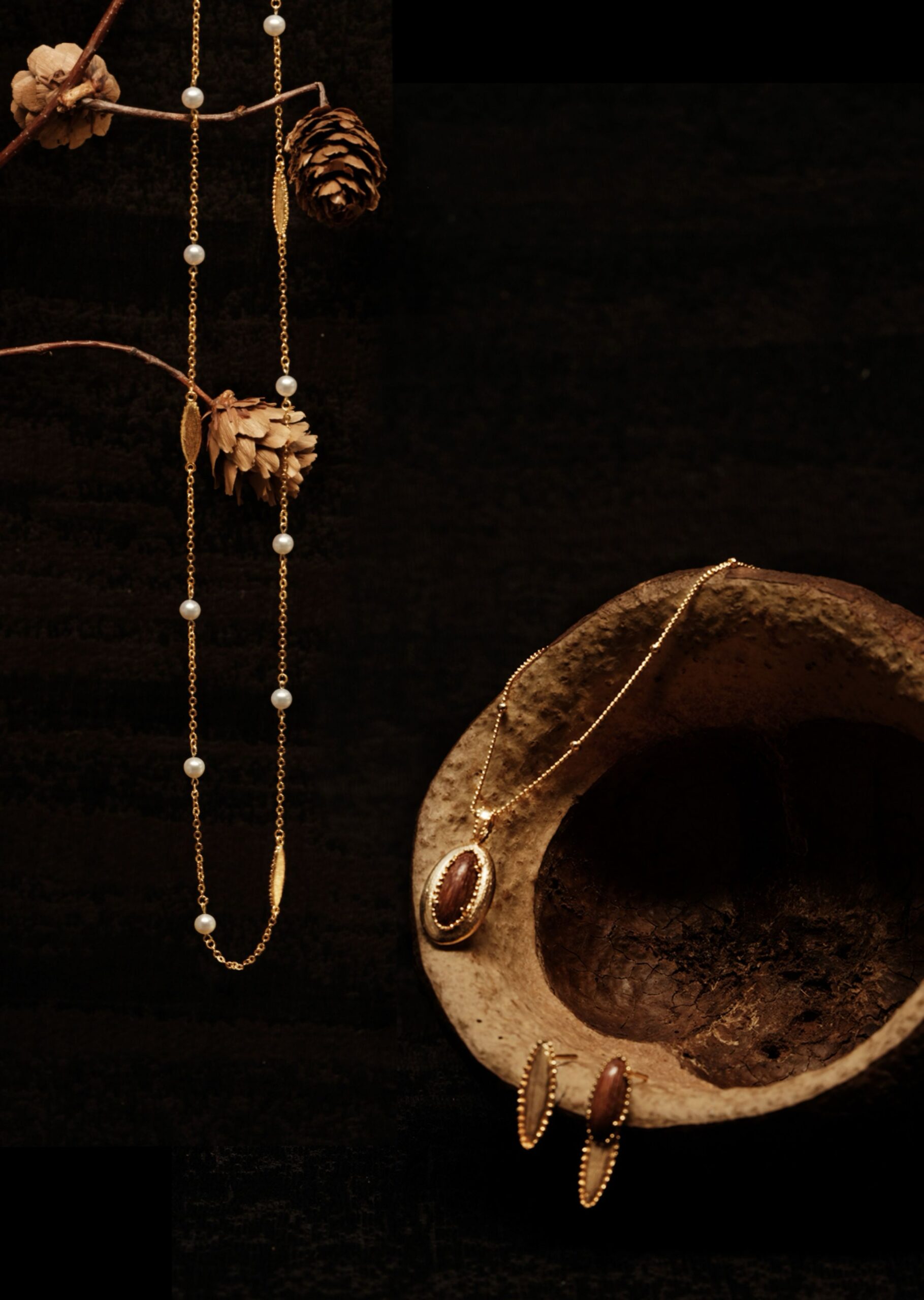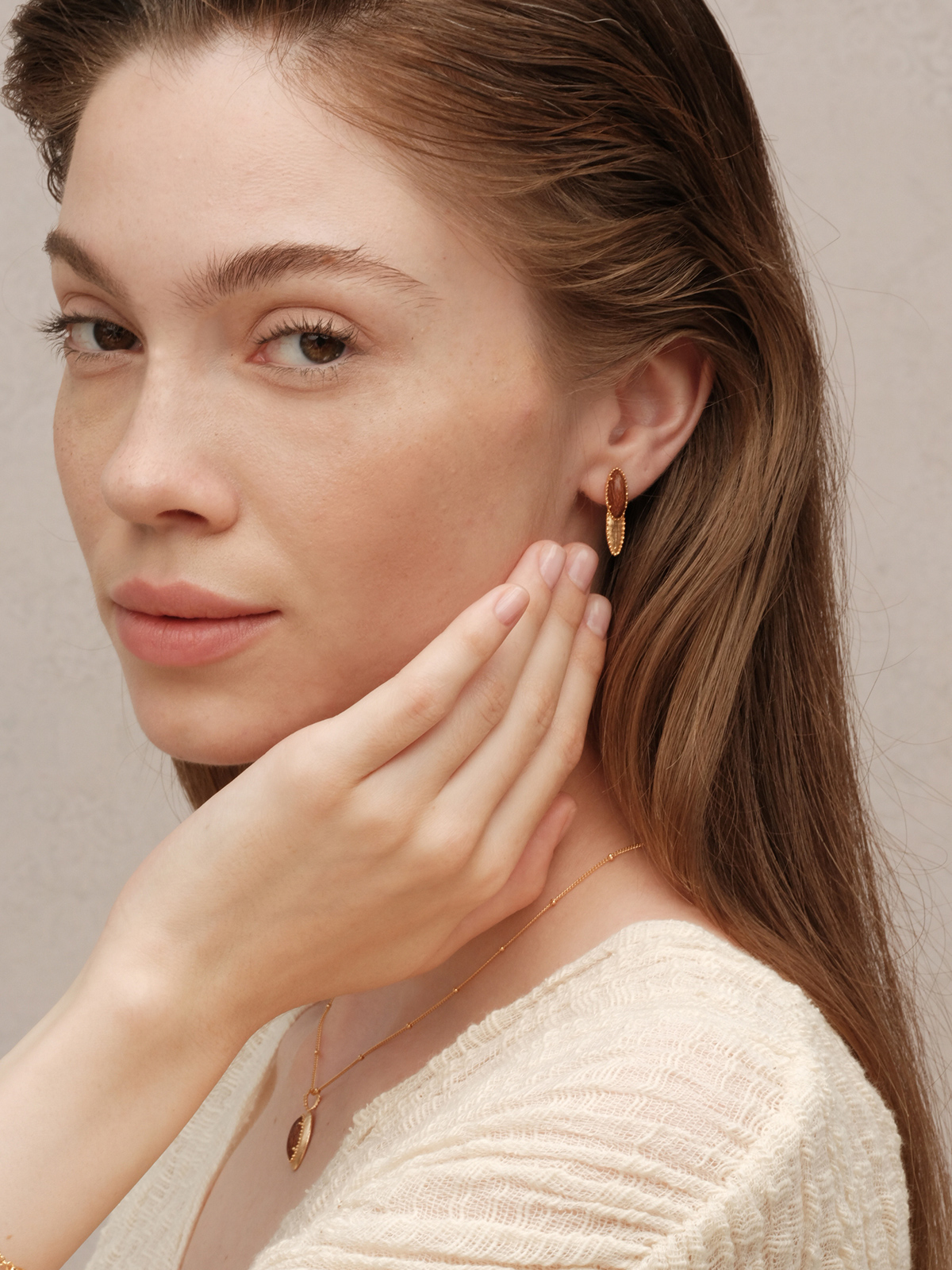 These earrings from the Everleaf Collection are designed as a mismatched pair, celebrating balance through asymmetry. Inspired by osmanthus leaves, the design combines natural golden nanmu wood with refined gold vermeil to evoke the warmth of autumn and the serenity of nature.