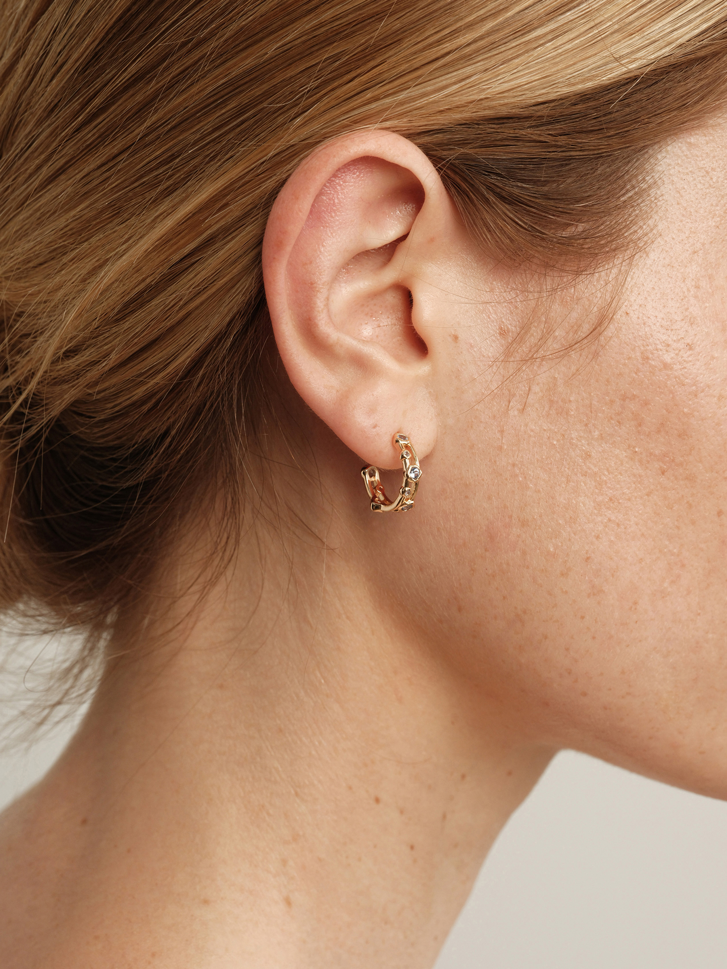The openwork C-shaped design frames the ear gracefully, with light dancing through each stone like glimmers between clouds. Minimal yet striking, these hoops embody both the coolness of rain and the warmth of gold, balancing clarity and softness in perfect harmony.