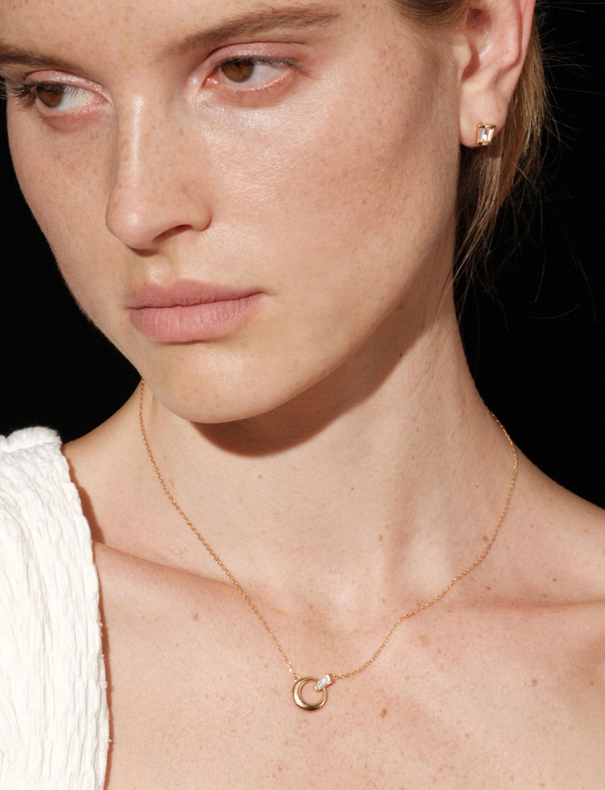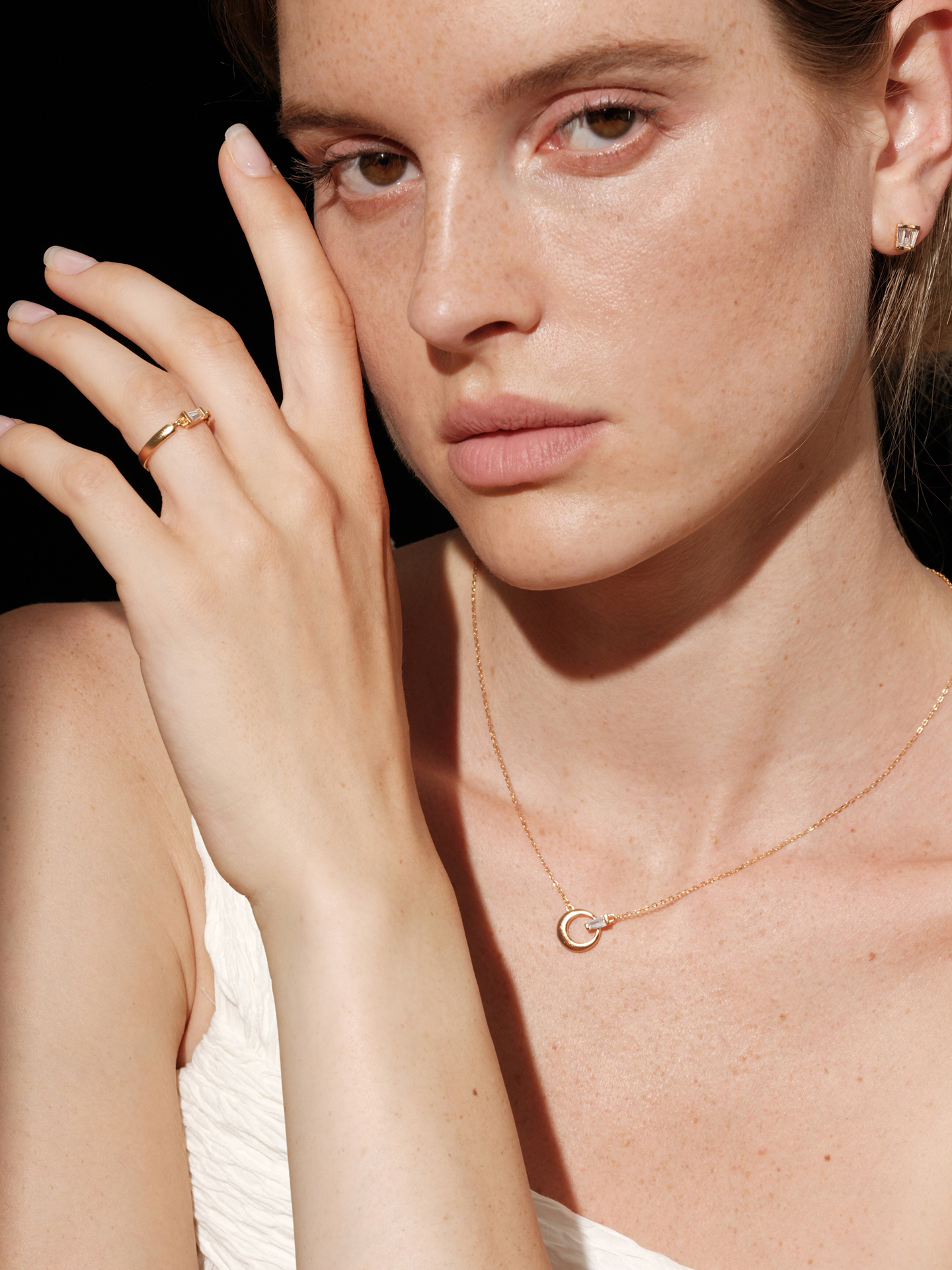 Each facet of the baguette-cut cubic zirconia reflects a cascade of brilliance—like fragments of Seoul’s endless city lights scattered across the skyline. Framed in warm gold-plated silver, the design balances sharp modernity with understated elegance.
