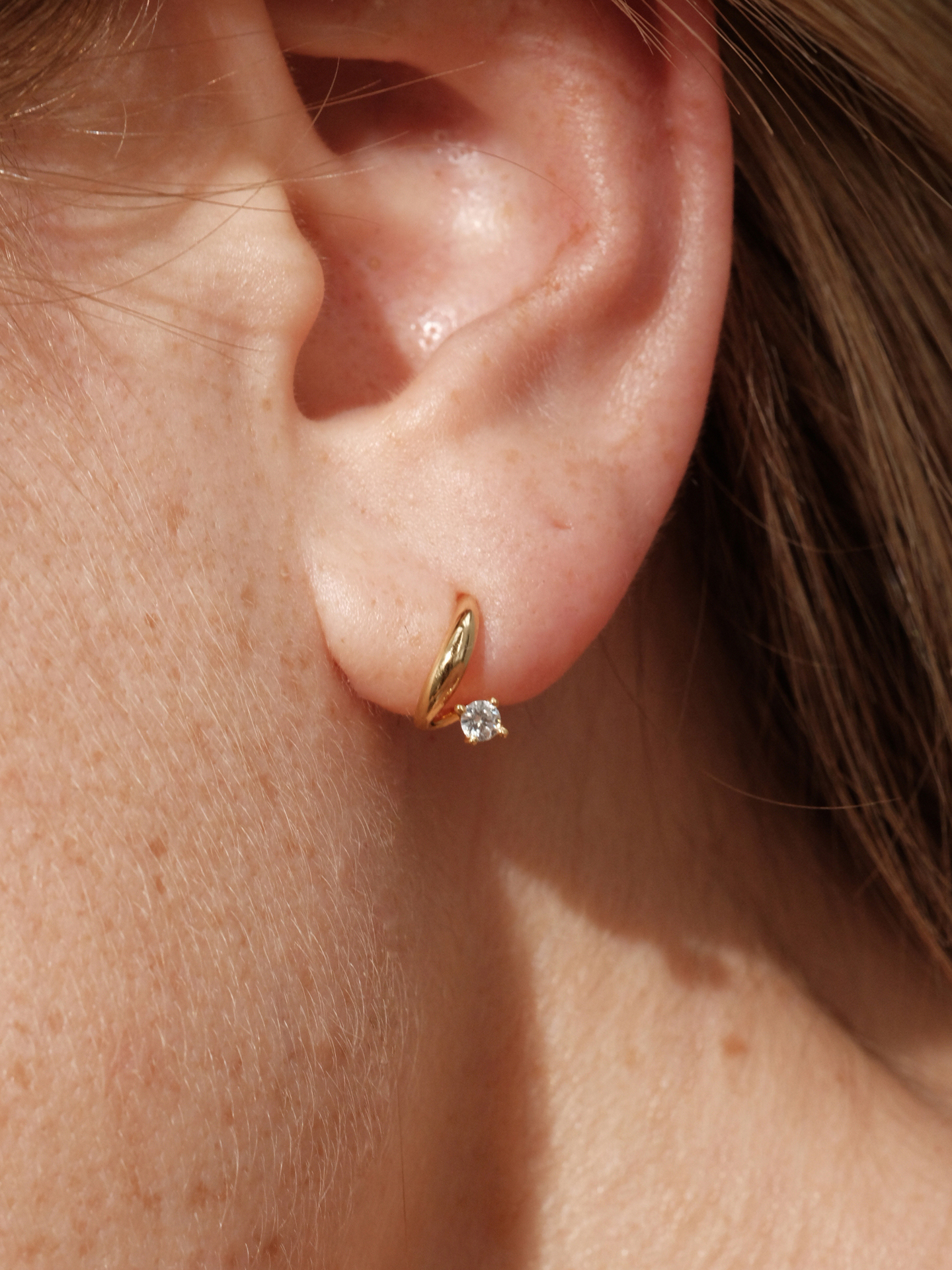 Inspired by the Turkish word Yakamoz—meaning “the reflection of moonlight on water”—these earrings capture the poetic image of stars scattered on a quiet sea. Their flowing golden curves trace the dance of light over rippling water, holding the brilliance of a single stone like a suspended star.