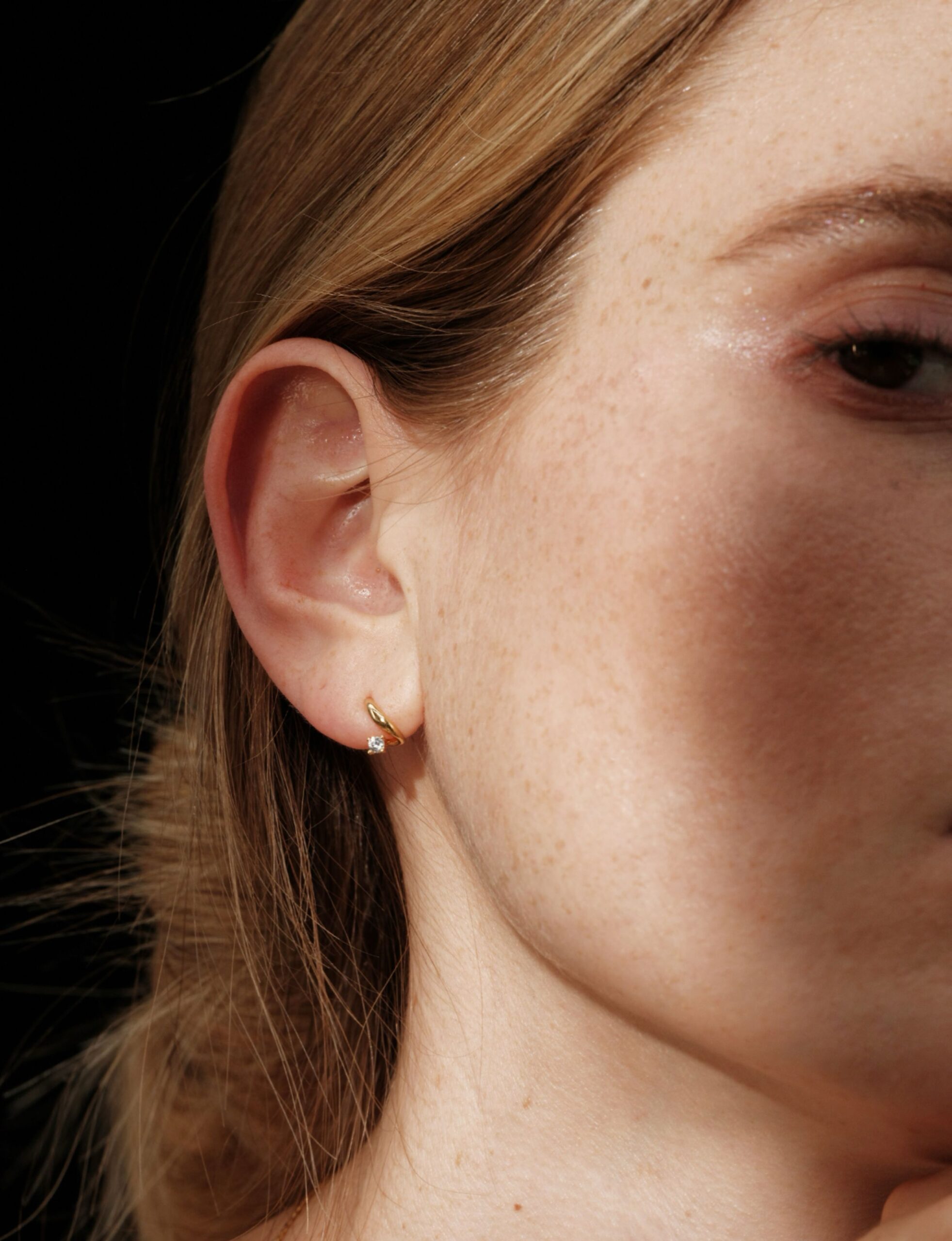 Minimalist Poise: Small yet sculptural, the earrings hug the earlobe for a refined, modern look.