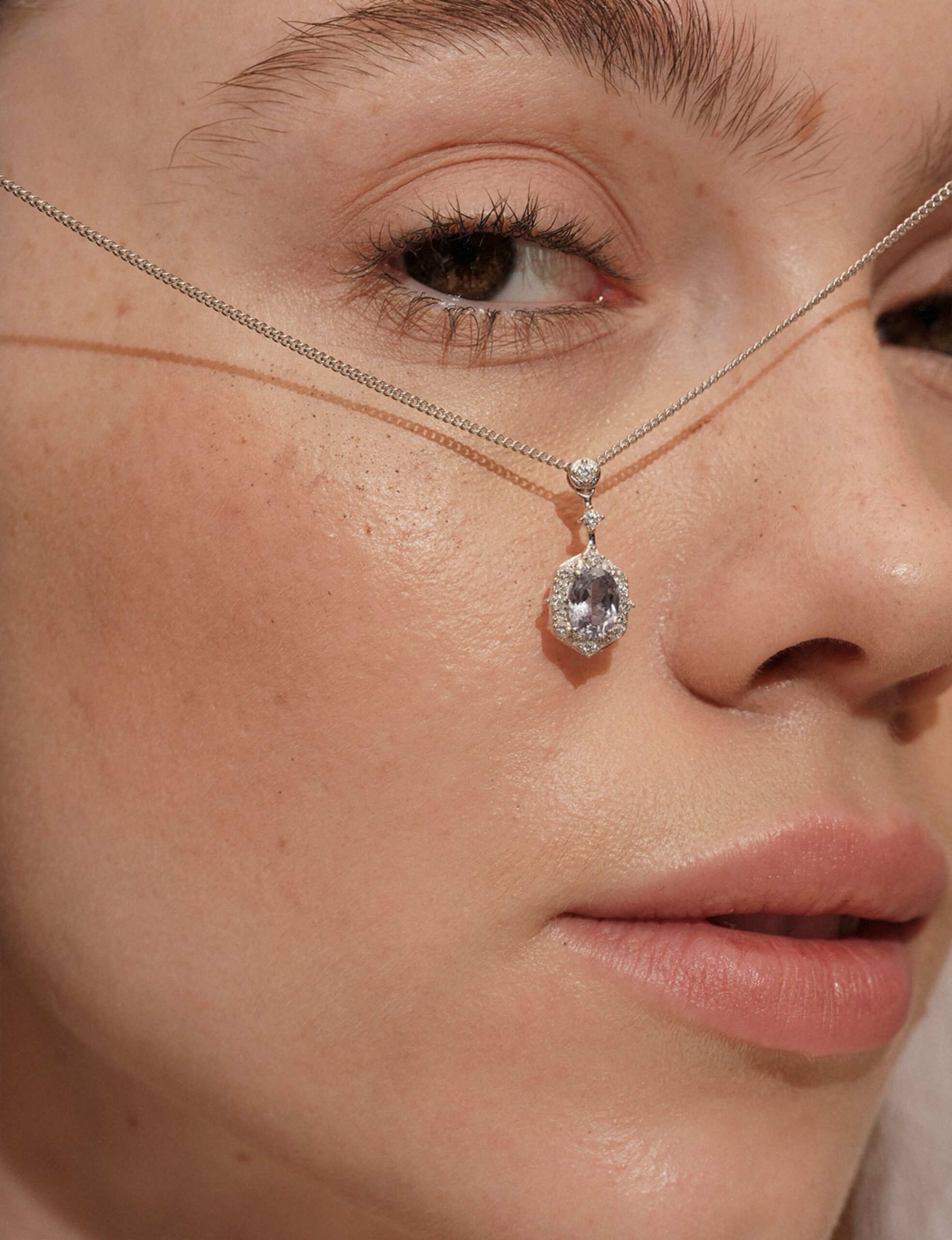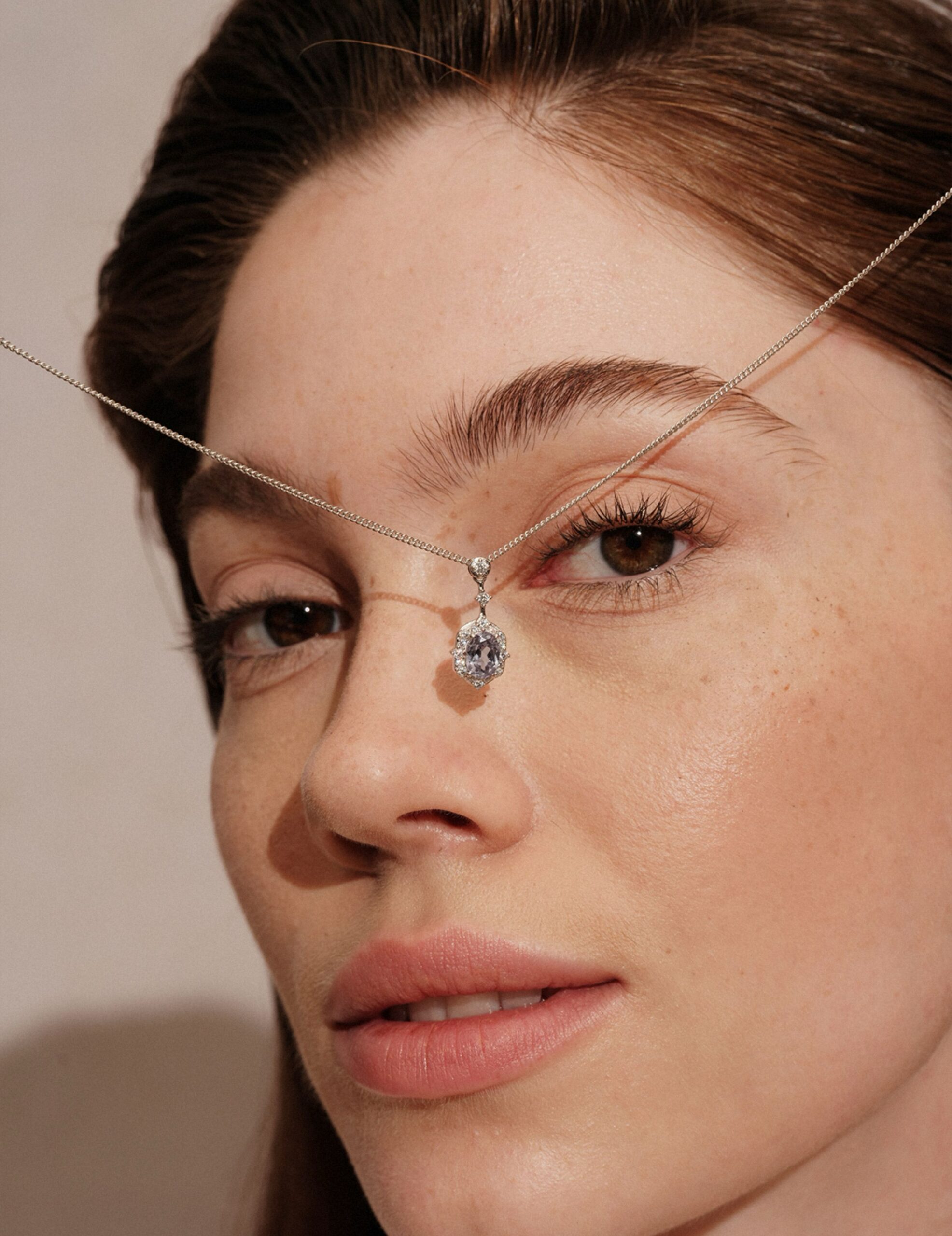 Surrounded by meticulously set brilliant stones in a vintage cluster style, the necklace shimmers like starlight around the moon—capturing both regal grandeur and subtle personal strength.