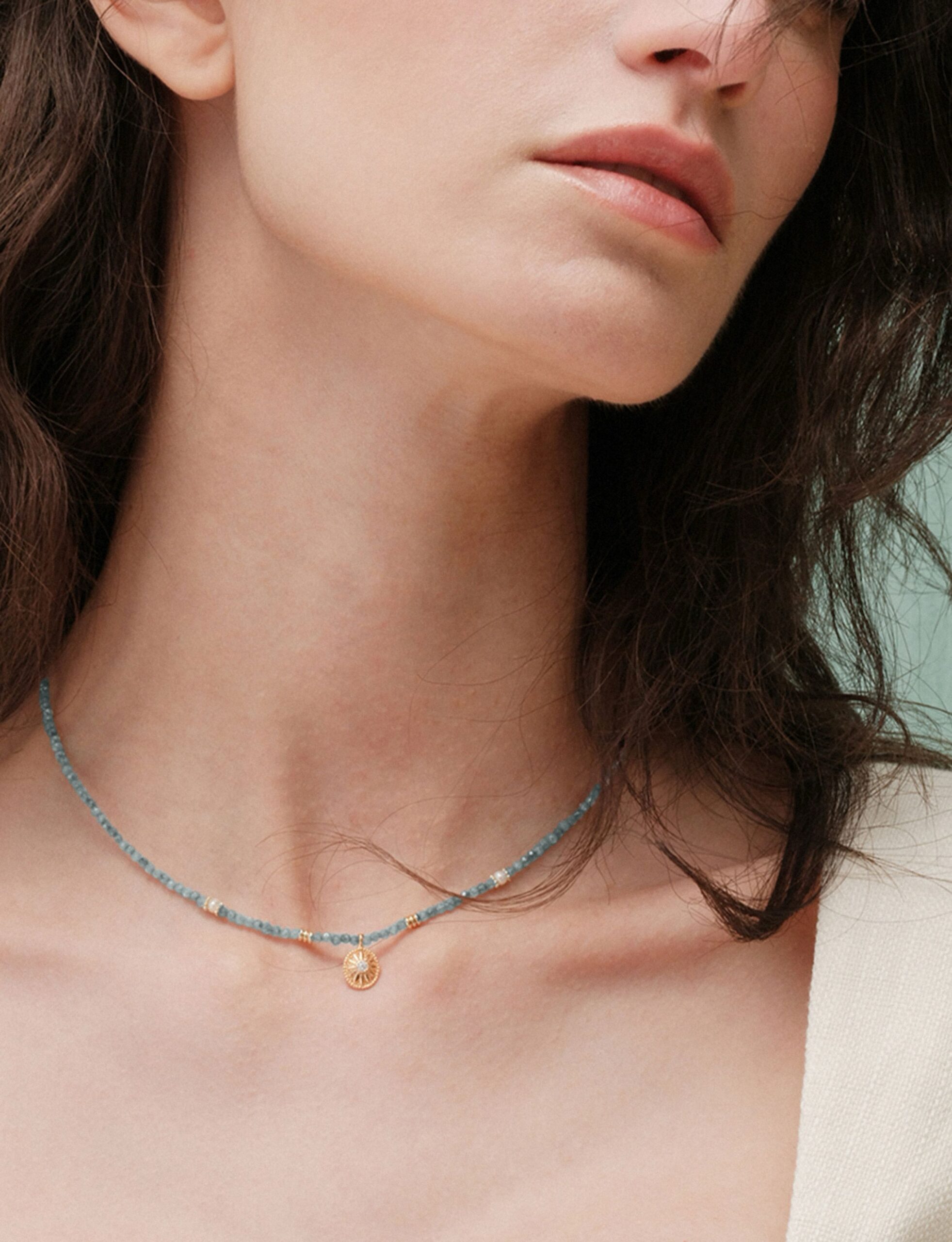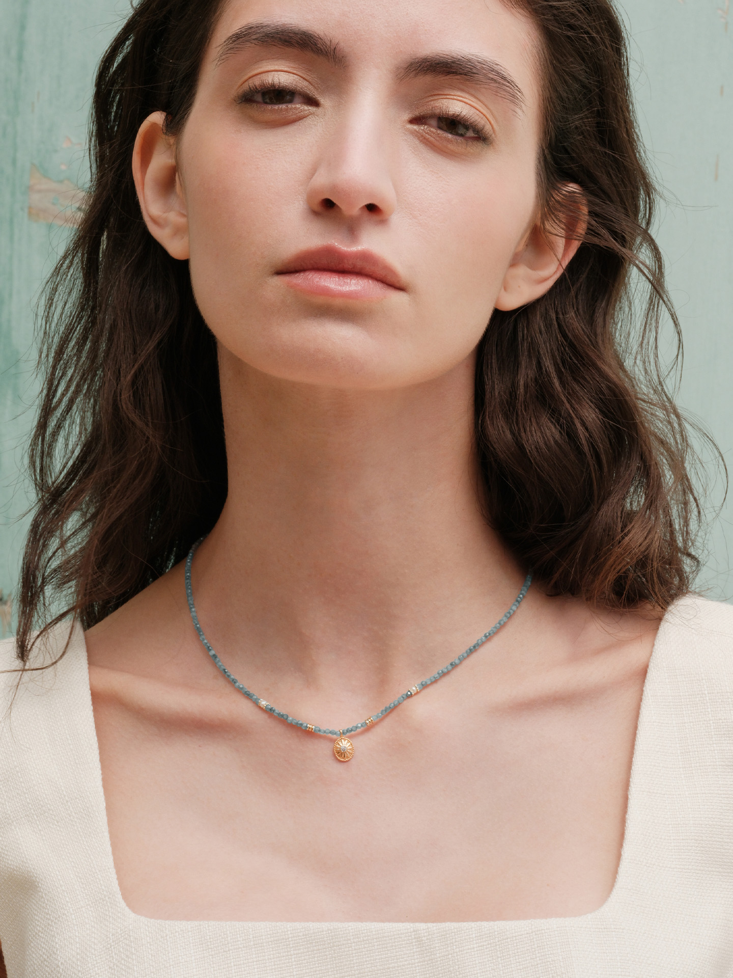 Inspired by the quiet beauty of a seaside sunrise, this necklace carries the spirit of a spontaneous getaway. The soft blue beads recall the calm surface of the ocean, kissed by the first light of day, while the sunburst medallion pendant radiates warmth and optimism.